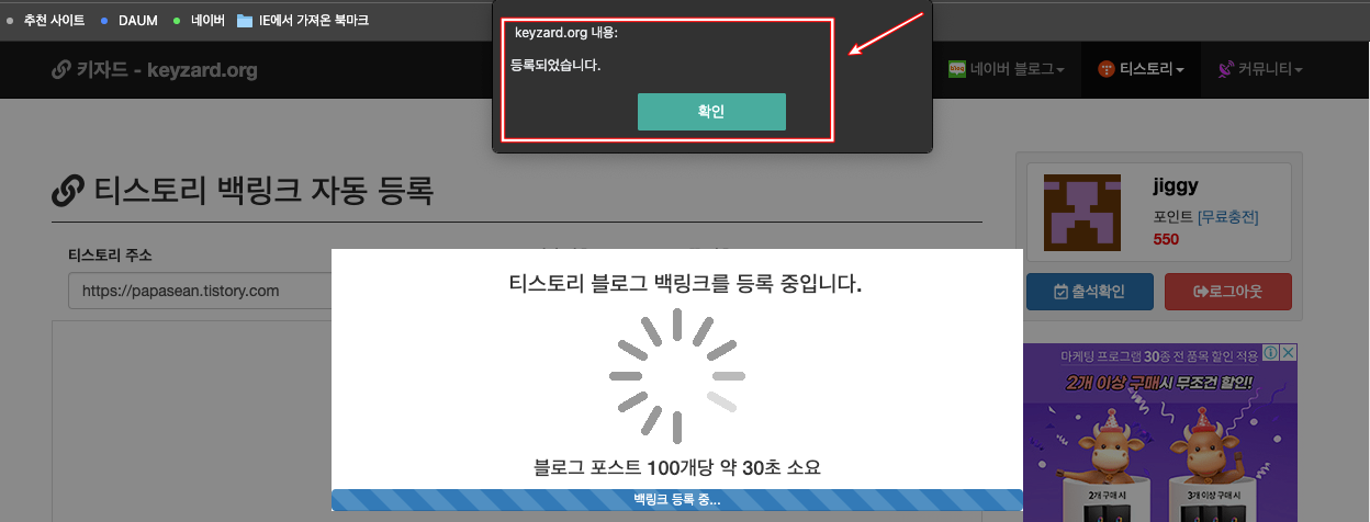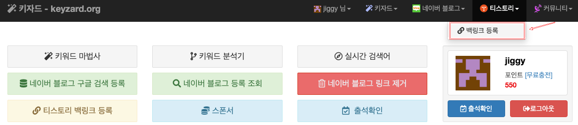 키자드 사이트에서는 무료로 티스토리의 블로그 포스트 별 백링크를 등록시켜 줍니다.