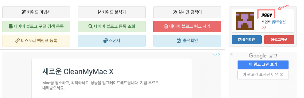 회원가입을 마치고 나면 사이트 우측 상단에 자신의 닉네임이 나옵니다.
