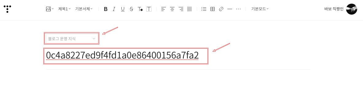 글쓰기 화면에 우선 카테고리 지정을 해주고, 제목란에 연동 코드를 붙여 넣습니다.